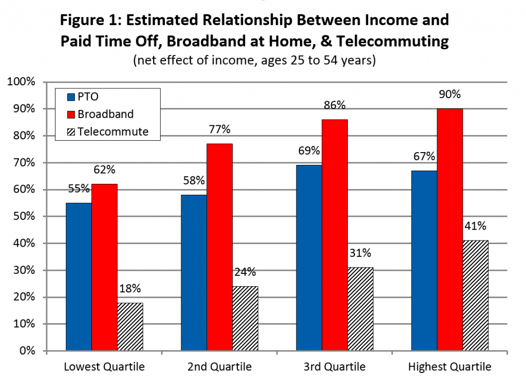The differences in the “net” percentages across income and education groups are significant and important (see Figures 1 and 2). Someone with a bachelor’s degree is nearly 1.6 times more likely to have PTO (69 percent v. 44 percent), more than 1.4 times more likely to have high-speed internet at home (88 percent v. 61 percent), and about 2.6 times more likely to telecommute (40 percent v. 15 percent), assuming all other factors ceteris paribus, compared to the lowest education category, and we see similar patterns across the income quartiles.