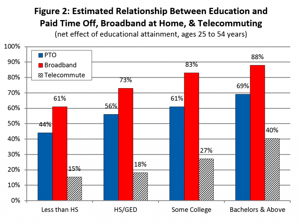 Based on our analysis of prime working age adults from 25 to 54 years old, an estimated 62 percent of workers have some form of PTO,[7] about 30 percent can telecommute when away from their usual workplace,[8] and an estimated 81 percent of households have broadband in the home.[9] However, there are significant differences based on income and education levels, with individuals at lower income and education levels showing comparatively lower percentages.