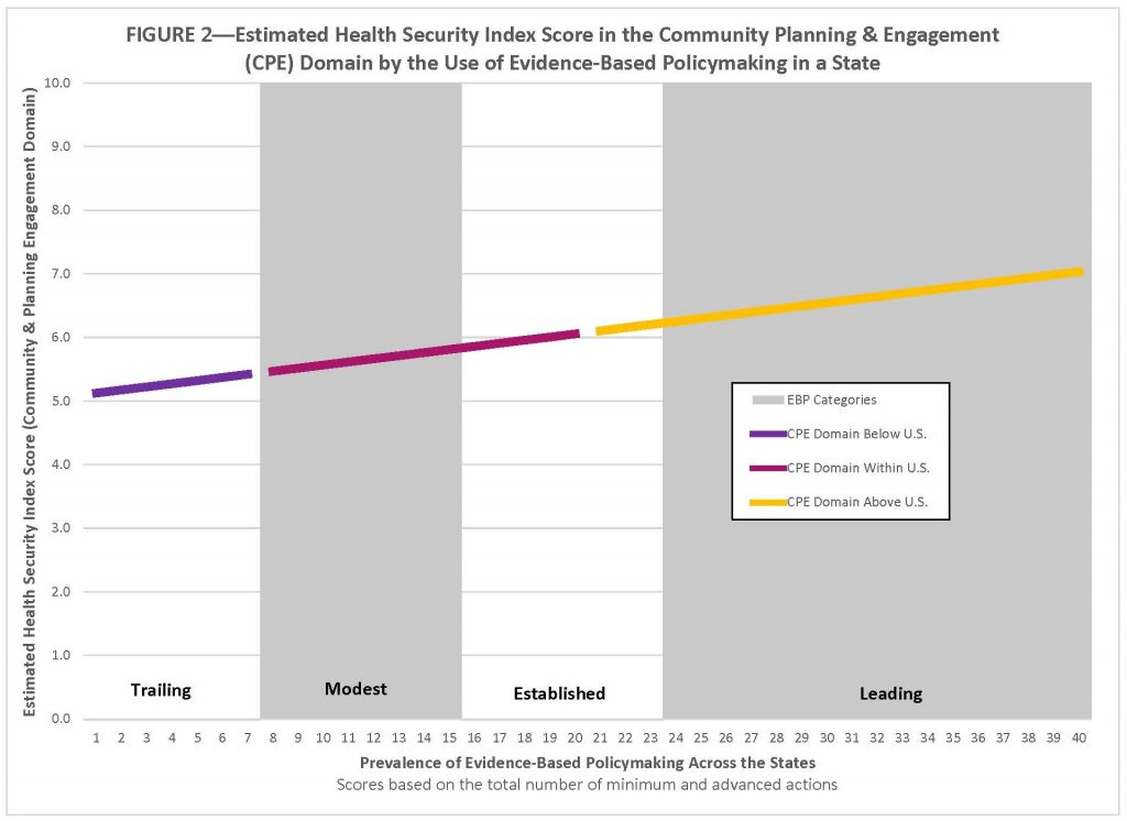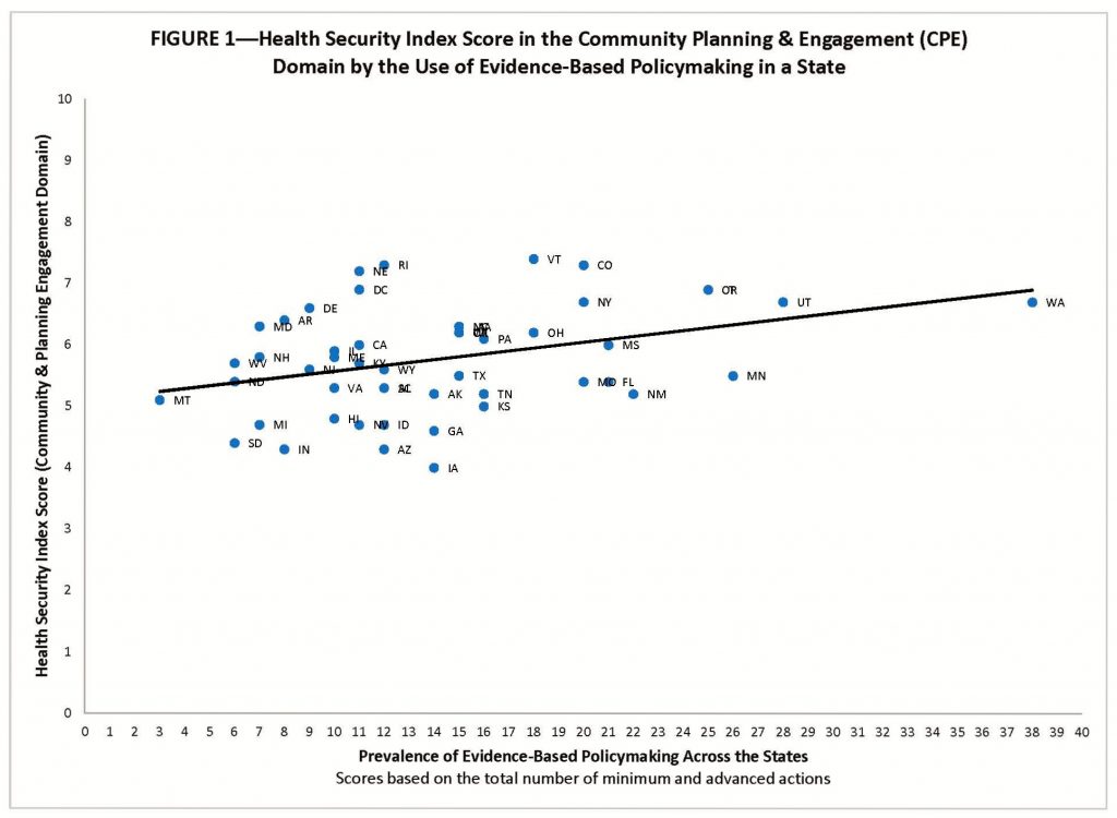 The National Health Security Preparedness Index measures the nation’s health security from a broad, multi-sectoral perspective using nearly 140 measures from more than 50 different sources. The Index tracks the nation’s progress in preparing for, responding to, and recovering from disasters, disease outbreaks and other emergencies that pose risks to health and well-being. By aggregating large volumes of data from national household surveys, medical records, safety inspection results, and surveys of health agencies and facilities, the Index produces composite measures of health security for each U.S. state and the nation as a whole. The Index reveals strengths as well as vulnerabilities in the protections needed to keep people safe and healthy in the face of emergencies, and it tracks how these protections vary across the U.S. and change over time. Here we examine one facet of health security—community planning and engagement. Specifically, we look at state-level performance in this area and the role of evidence-based policymaking in enhancing it. Our analysis reveals a statistically significant relationship between a state’s embrace of evidence-based policymaking and its performance in community planning and engagement for health security.